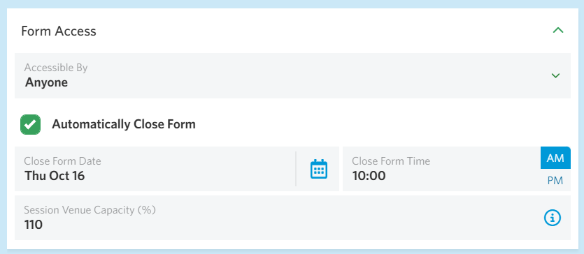 You can automatically close the form too on a specific date or venue capacity. By default we close the form on the start time/date of the last session in the event. We also recommend a Session Venue Capacity of 110% to allow a 10% overrun for no-shows.