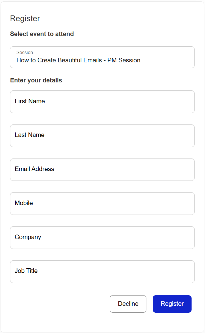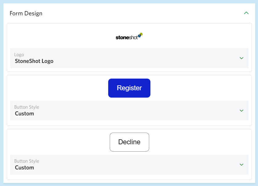 The Form Design section lets you customize your form’s visual elements, such as the logo and Register/Decline button styling. It’s fully synced with your Brand Manager, allowing you to choose from the logos and button styles already set up there. Any updates you make will instantly appear in the preview on the left.