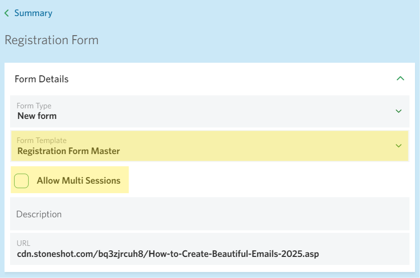You’ll see our default form which you can change by picking another on the Form Template dropdown. The default form shows all sessions in the event, allowing your client to choose a single session. If they can attend multiple sessions – for example a single-venue event with breakout sessions – check “Allow Multi Sessions” on the right.