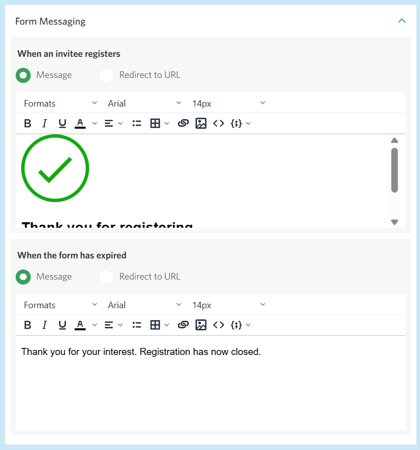 We’re nearly there! The last touches are the messaging around the When an invitee registers and When the form has expired. Alternatively, you can redirect to other pages by entering a URL.