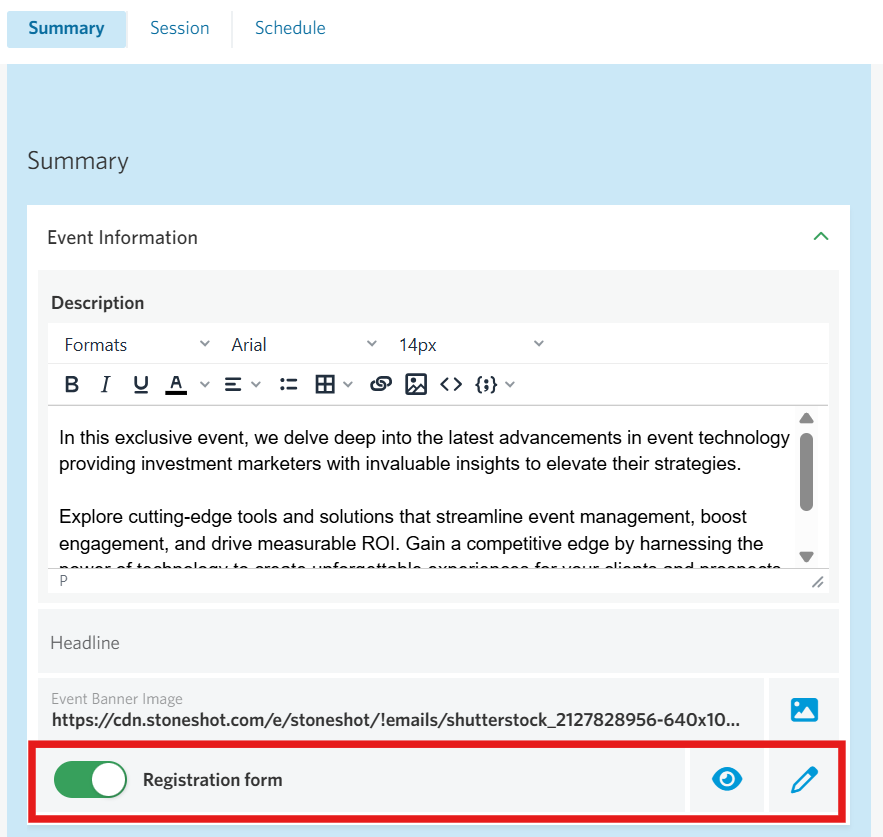 Let’s assume you’re using one from our library. Access the Form Builder via the blue edit pencil in the Registration form field within the Summary tab.