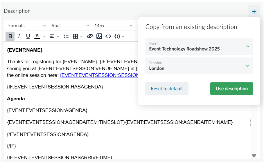 You can create a new calendar description from scratch, set one up with automation, or copy an existing description from a previous event or session.