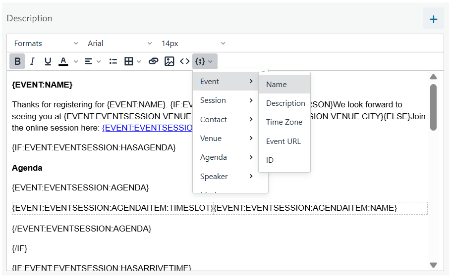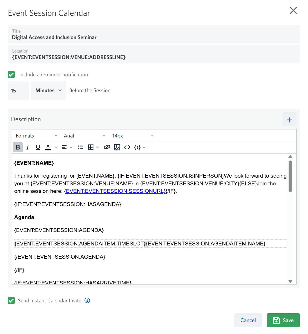 You can actually add a lot more – the event description, agenda, speakers, arrival time, map links… As you know, we’re big on automation so you can dynamically bring in this info from the event itself. You can also edit the calendar content for each session in the event.