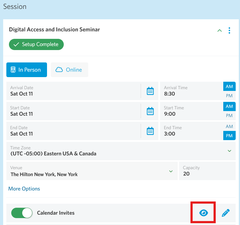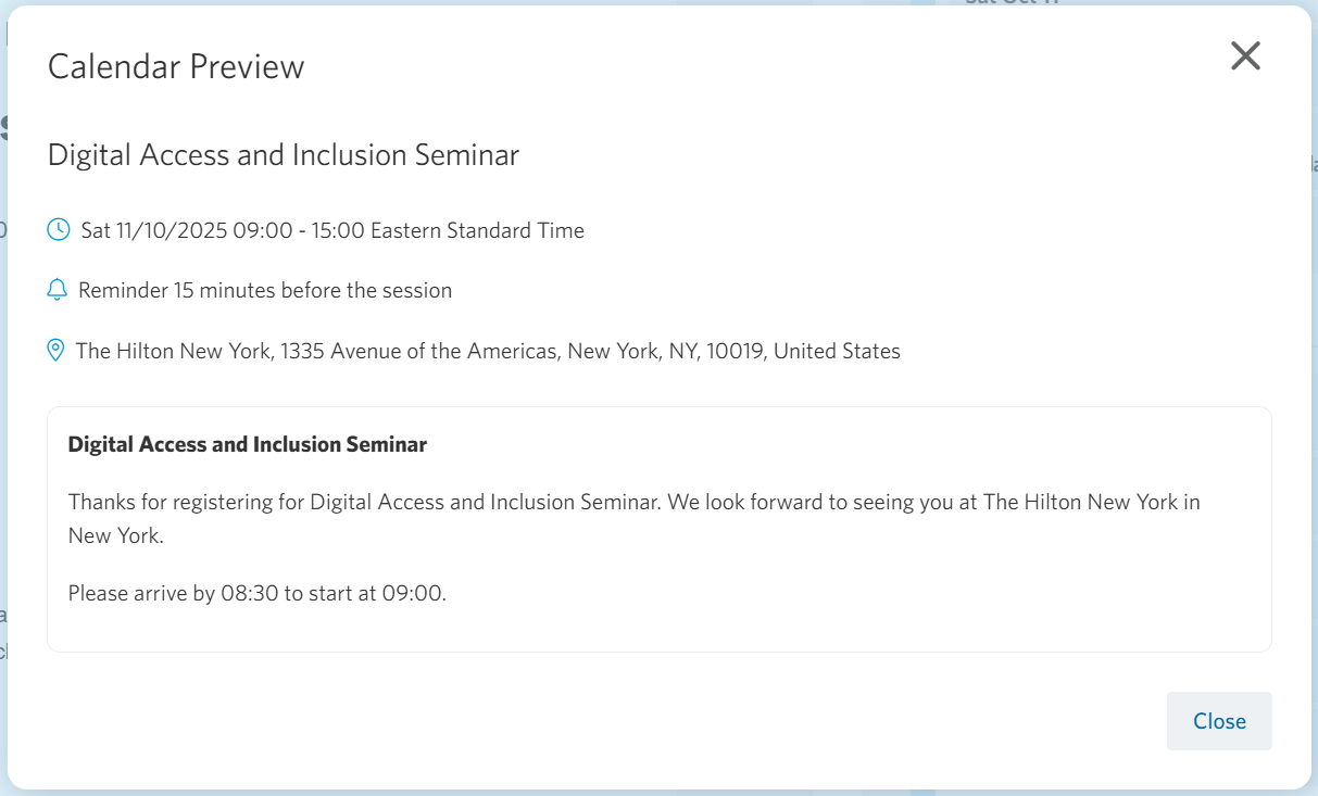 While you edit, click Preview in the session panel to see exactly how the invite will appear to registrants.